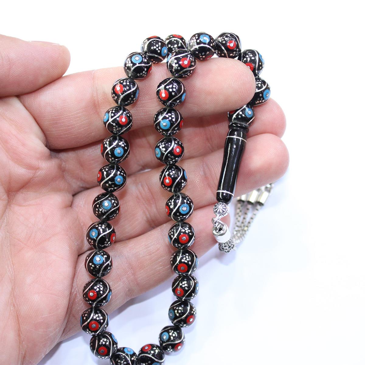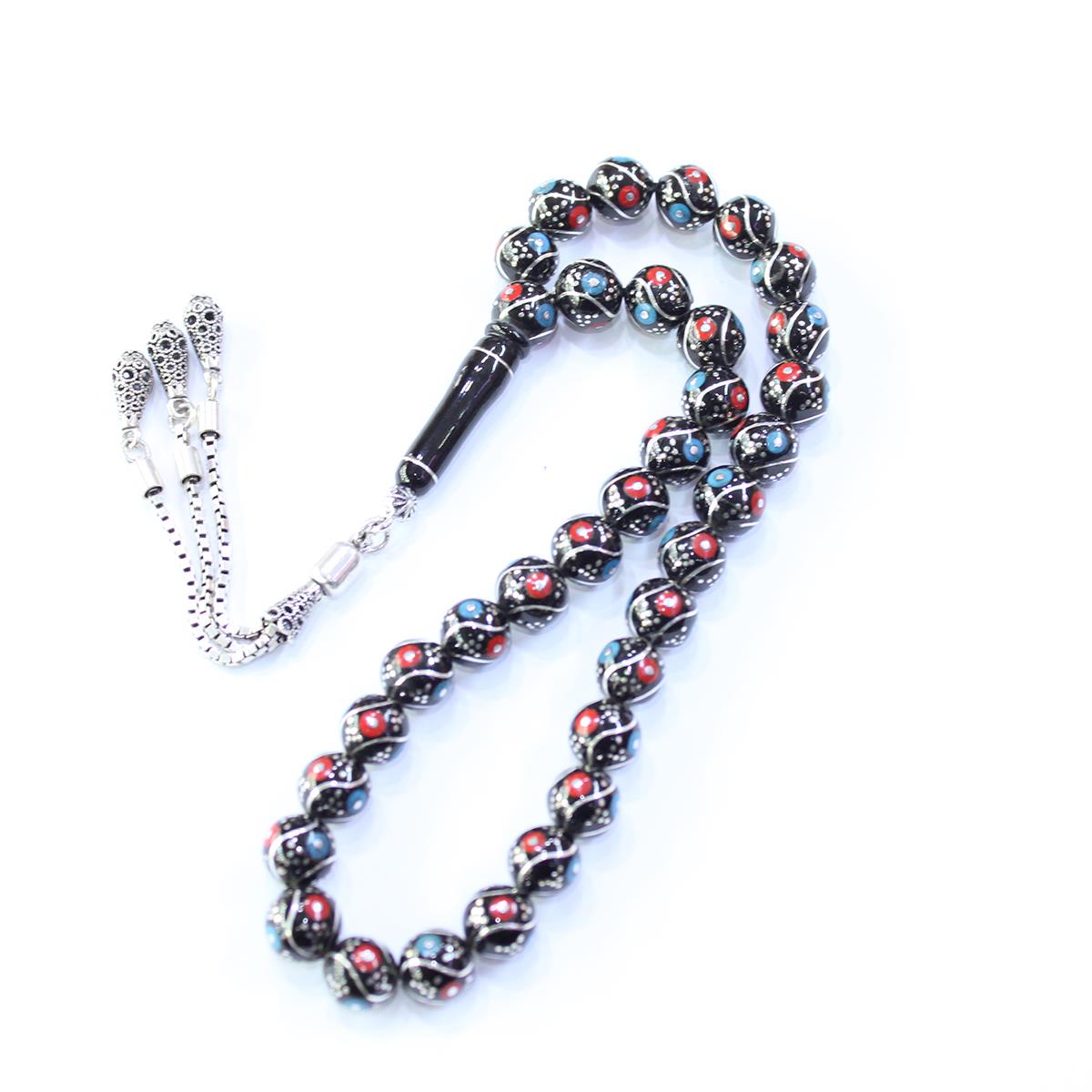 4 lü Çeşm-i Bülbül Mercan Firuze İşlemeli Oltu Taşı Tespih 8,5 (mm)