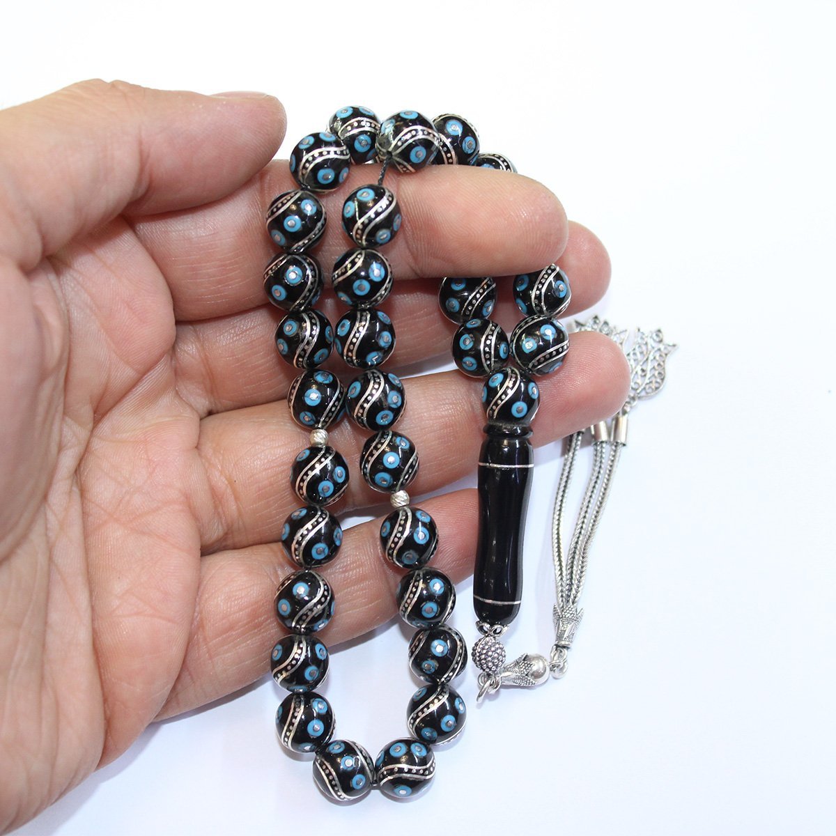 6 lı Çeşm-i Bülbül Firuze İşlemeli Oltu Taşı Tespih 9,5 (mm)