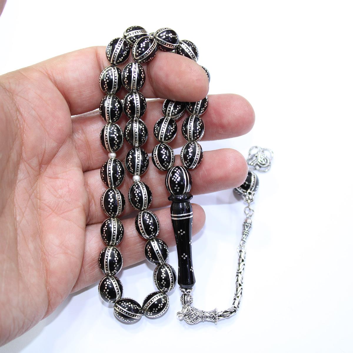 8'li Karpuz & Dörtlü İşlemeli Beyzi Oltu Taşı Tespih 8,5*10 (mm)