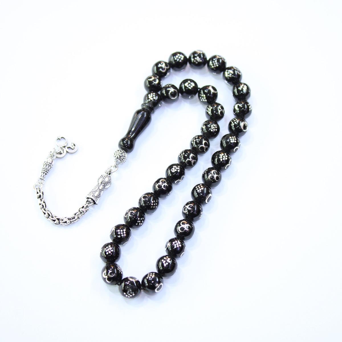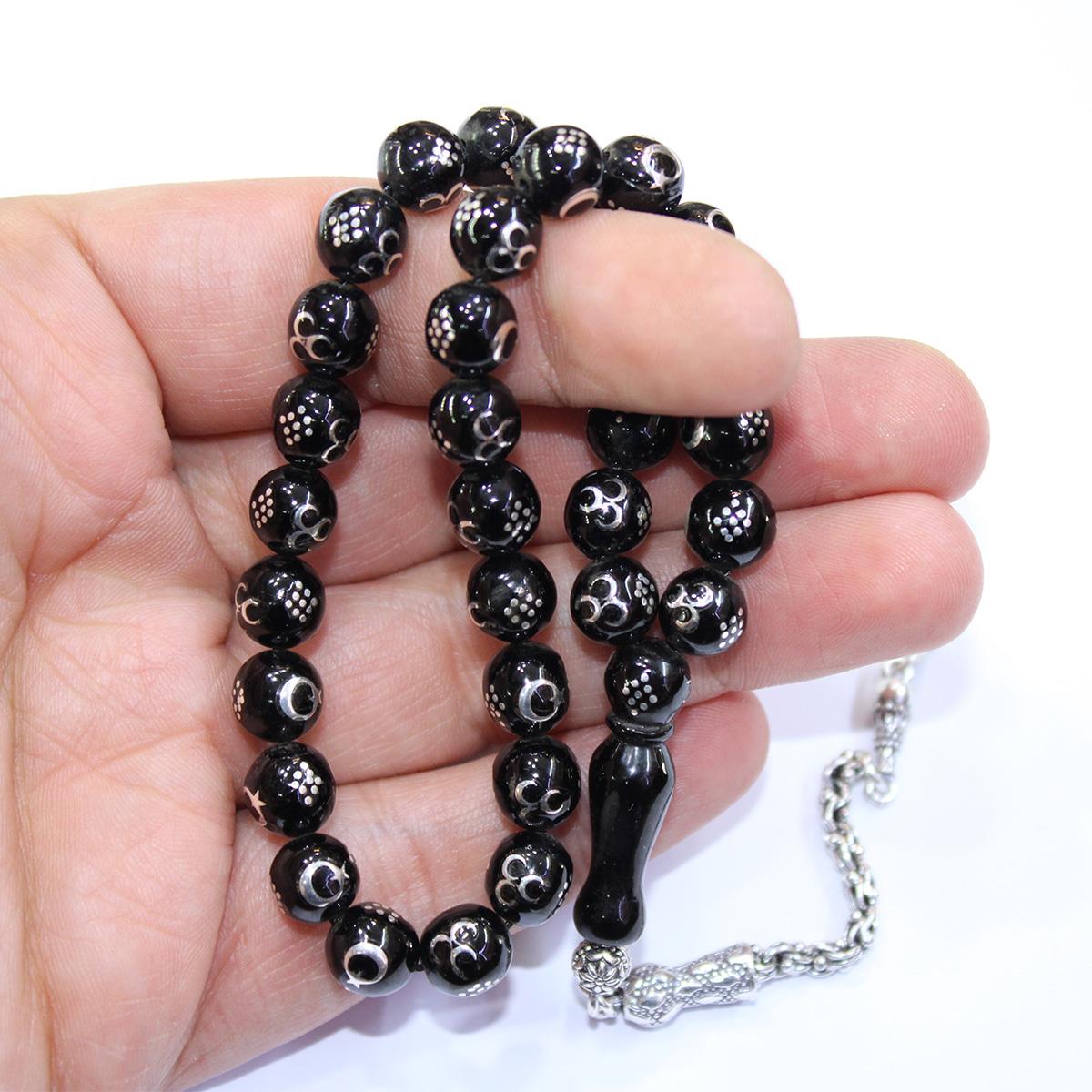 Ay Yıldız & Üç Hilal İşlemeli Oltu Taşı Tespih 8 (mm)