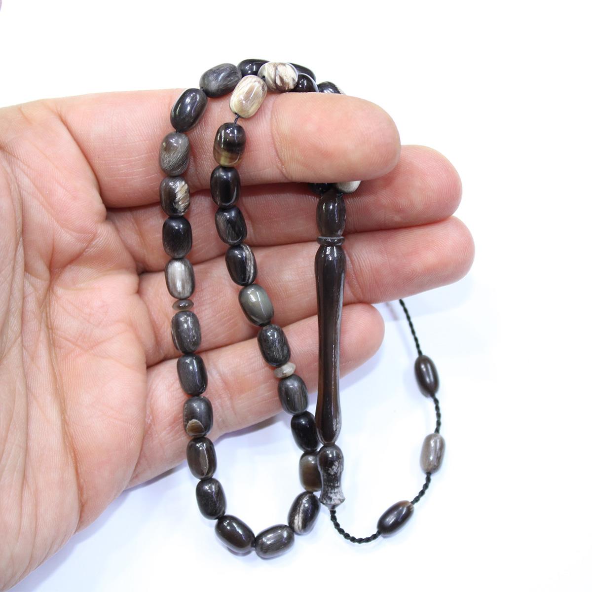 Renk bakımından siyah beyaz karışık olan alacalı gibi görünen tespihler bufalo boynuzu tespihin orijinalliğini gösterir. Bufalo boynuzu tespih zamanla kullanımda cila alır, parlar. 1-2 yıl sürekli kullanım sonrası rengi hafif sarımtırak olmaya başlar. Renk değiştirmez ama mükemmel parlak bir görüntü alır. Bufalo boynuzu tespihin hiçbir şekilde zararı yoktur. Aksine kişinin yorgunluğunu alır, eli terletmez. Bakım olarak 7-10 günde bir mikro-fiber bez ile badem yağı sürülebilir.