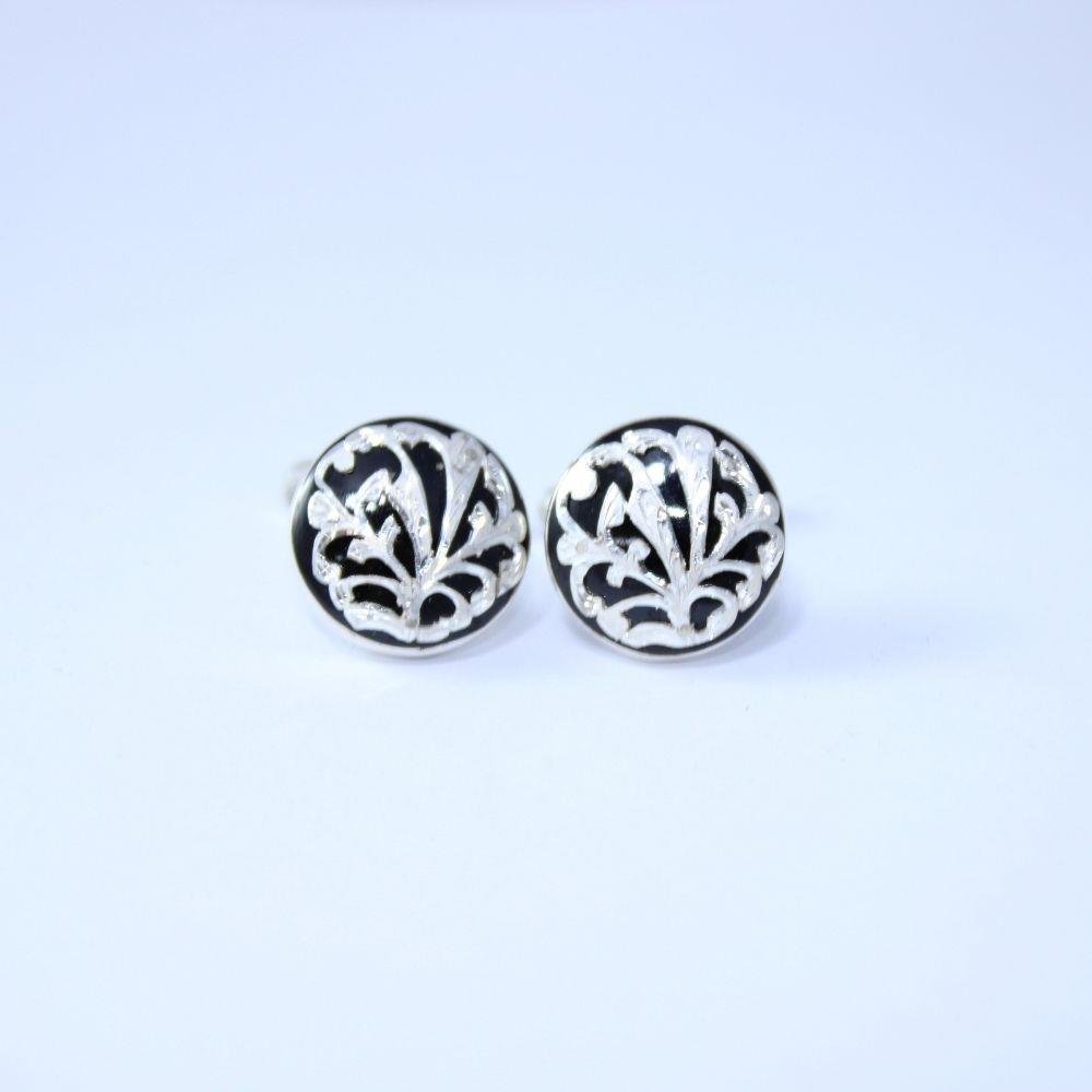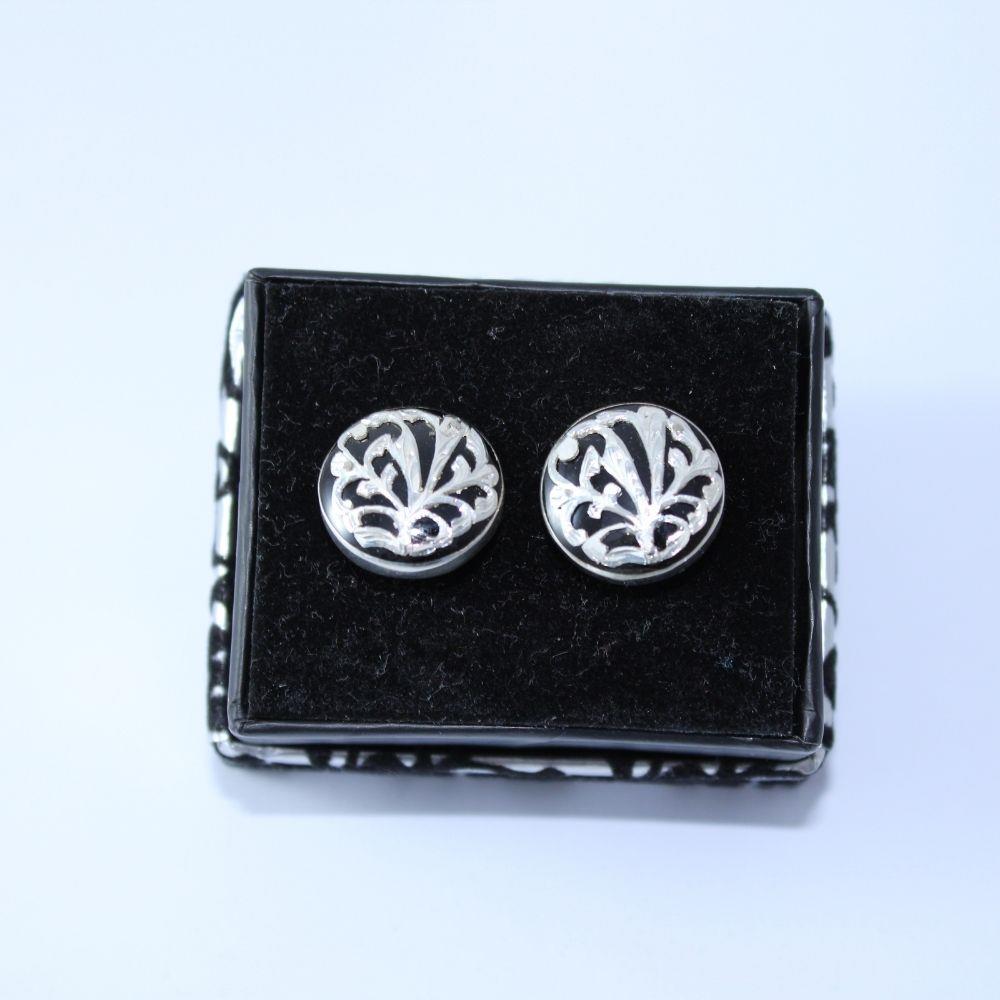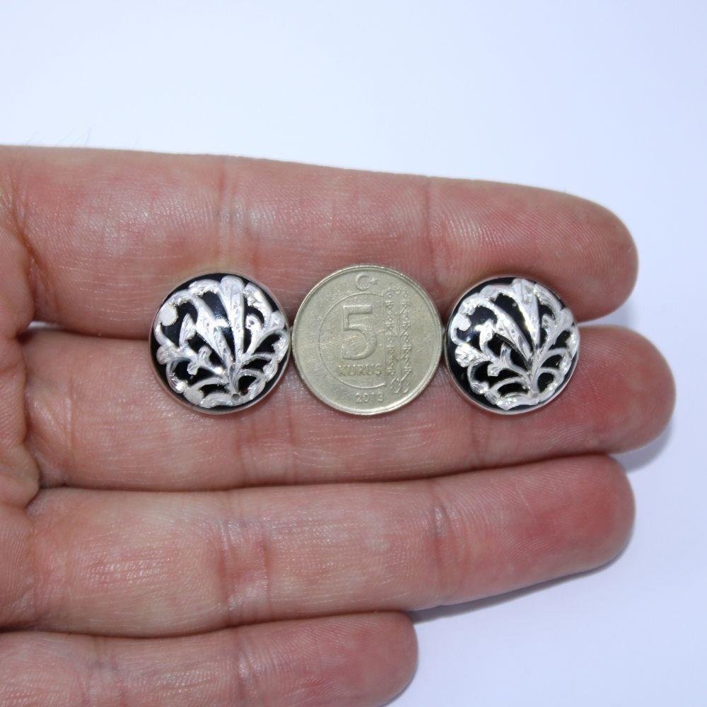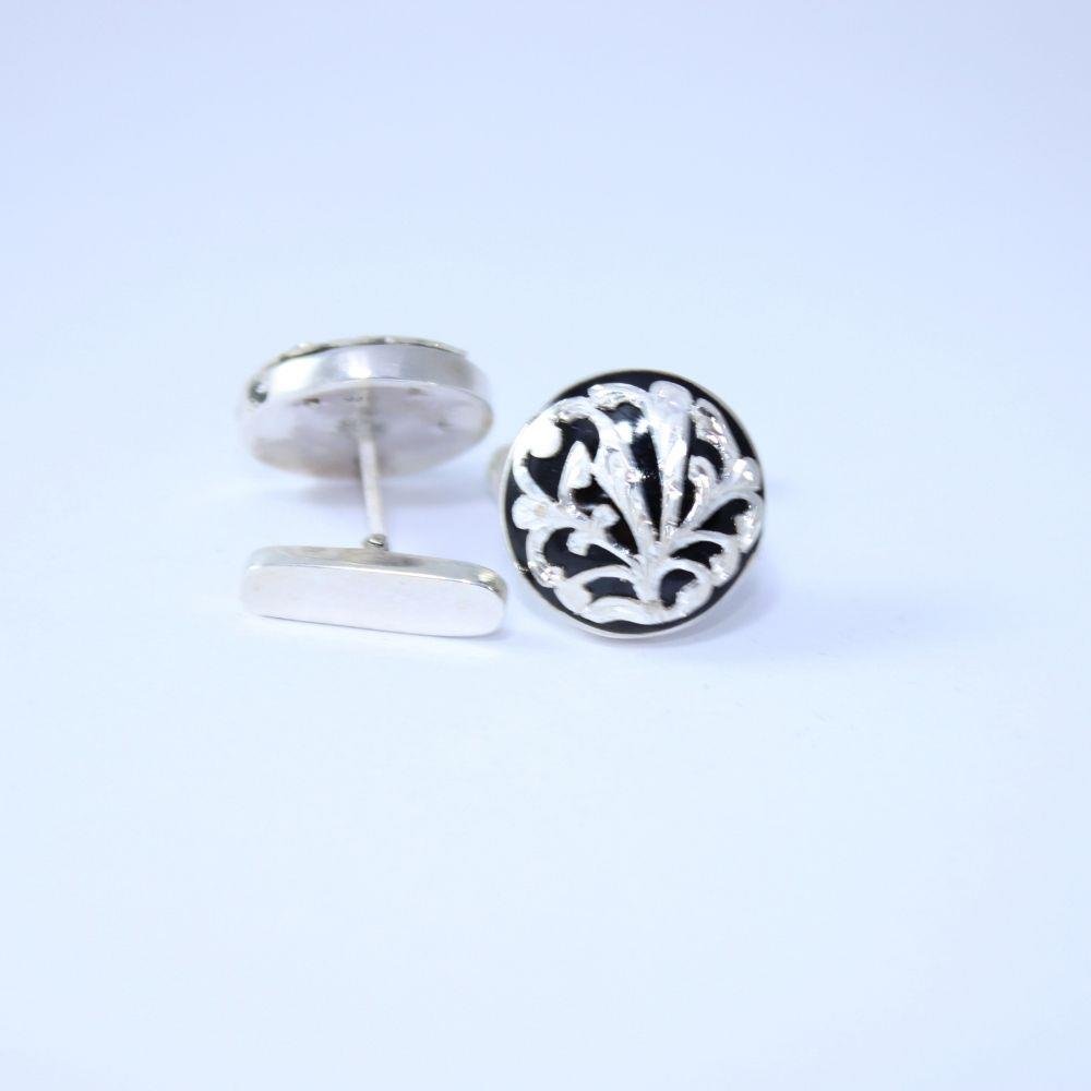 El Yapımı 925 Ayar Gümüş Kasa Üzerine Oltu Taşlı Kadın Kol Düğmesi Yuvarlak Desen