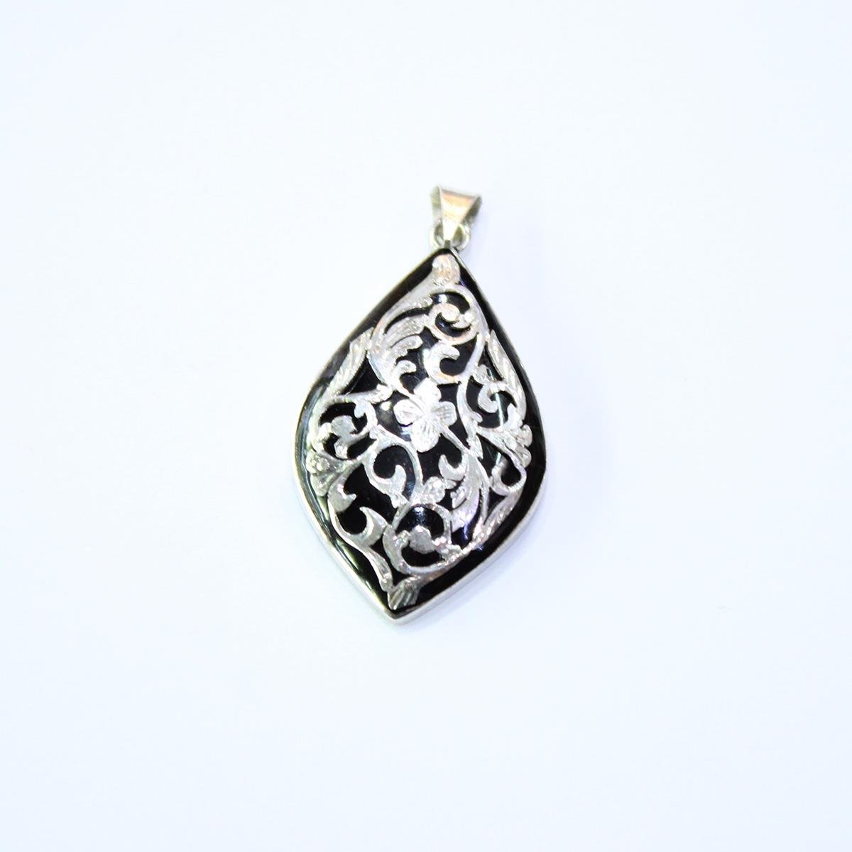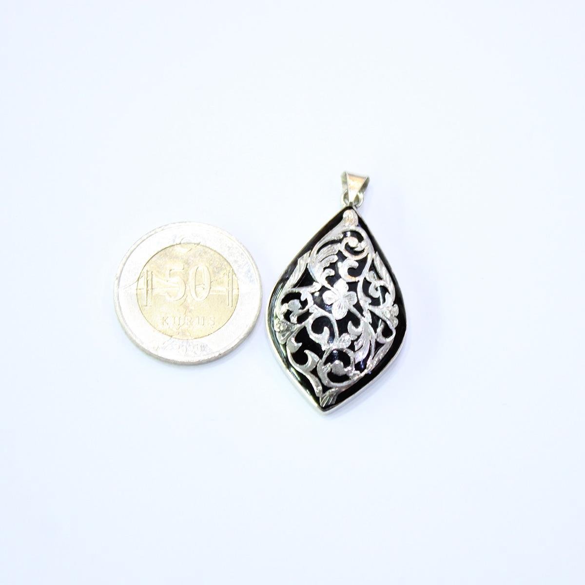 El Yapımı Gümüş Oltu Taşı Güllü Kolye Baklava Model No-3