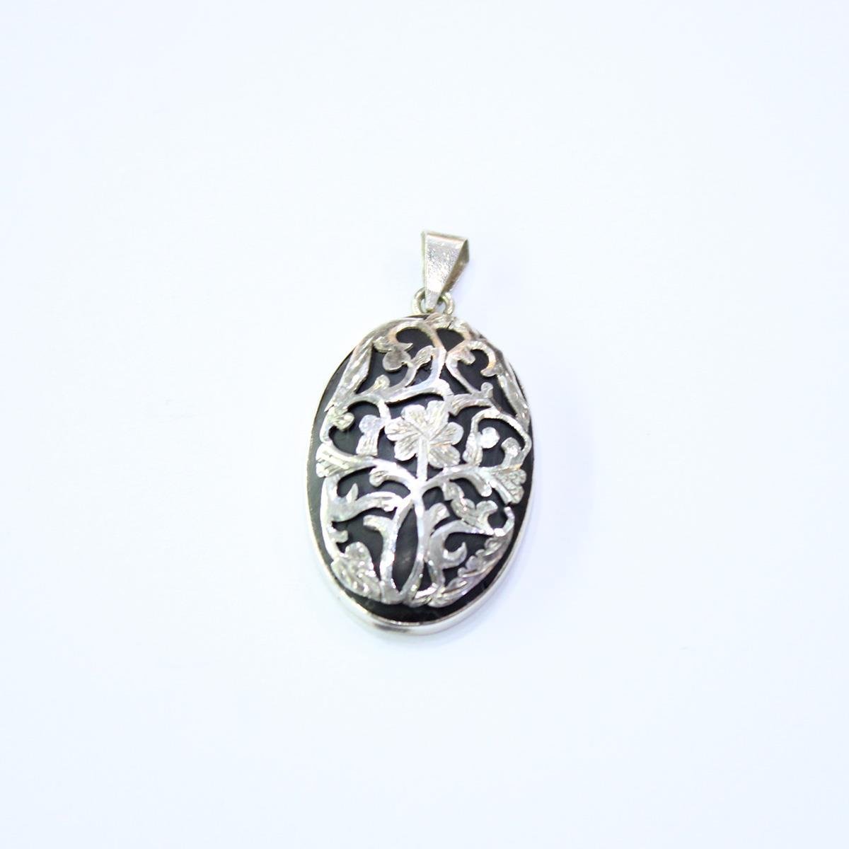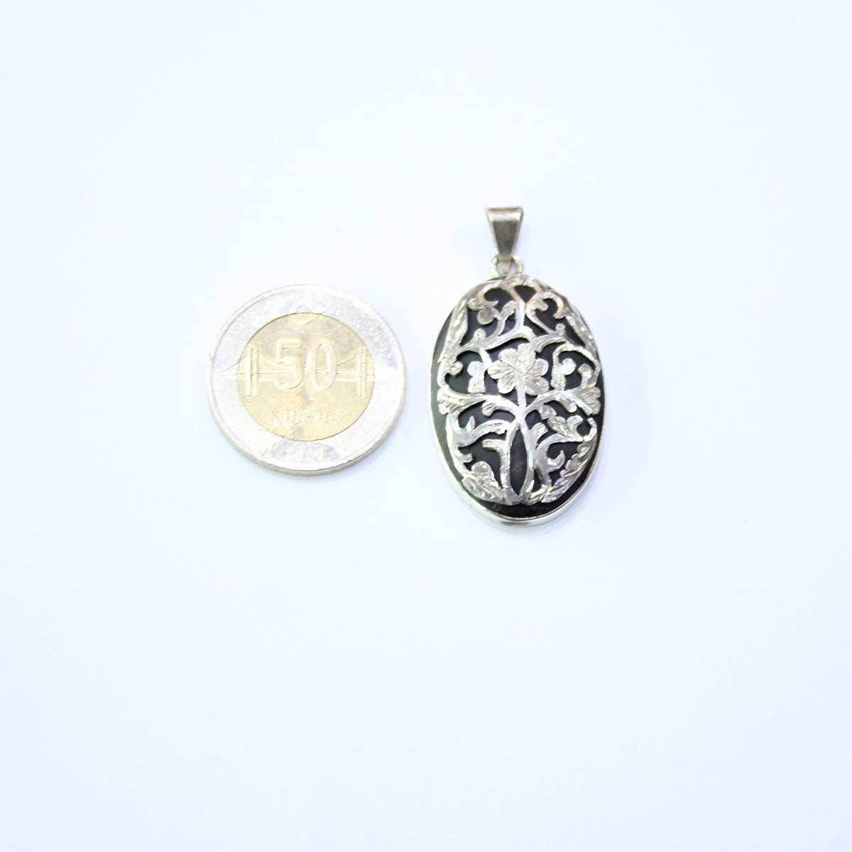 El Yapımı Gümüş Oltu Taşı Güllü Kolye Oval Model No-3