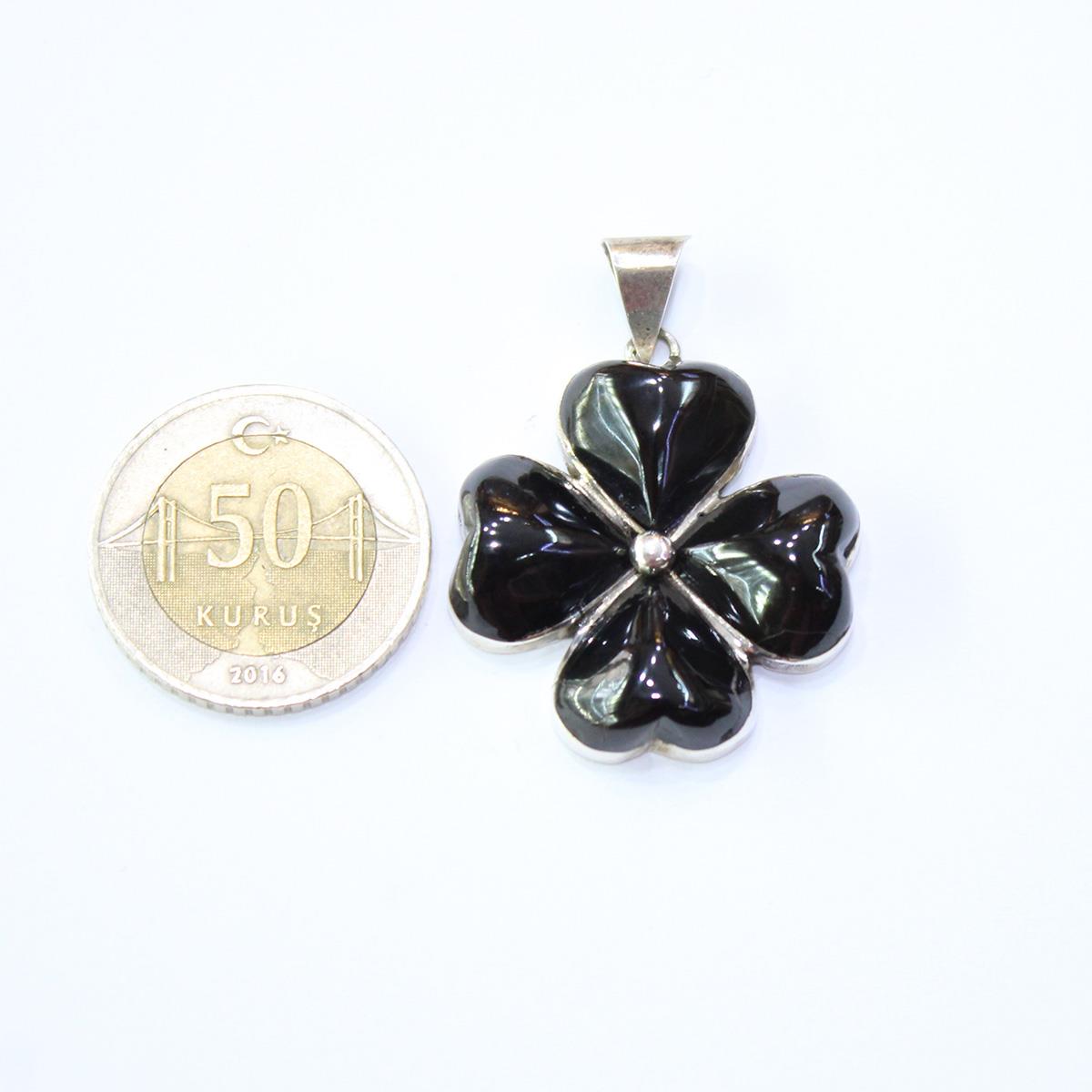 El Yapımı Gümüş Oltu Taşı Yonca Kolye No-2