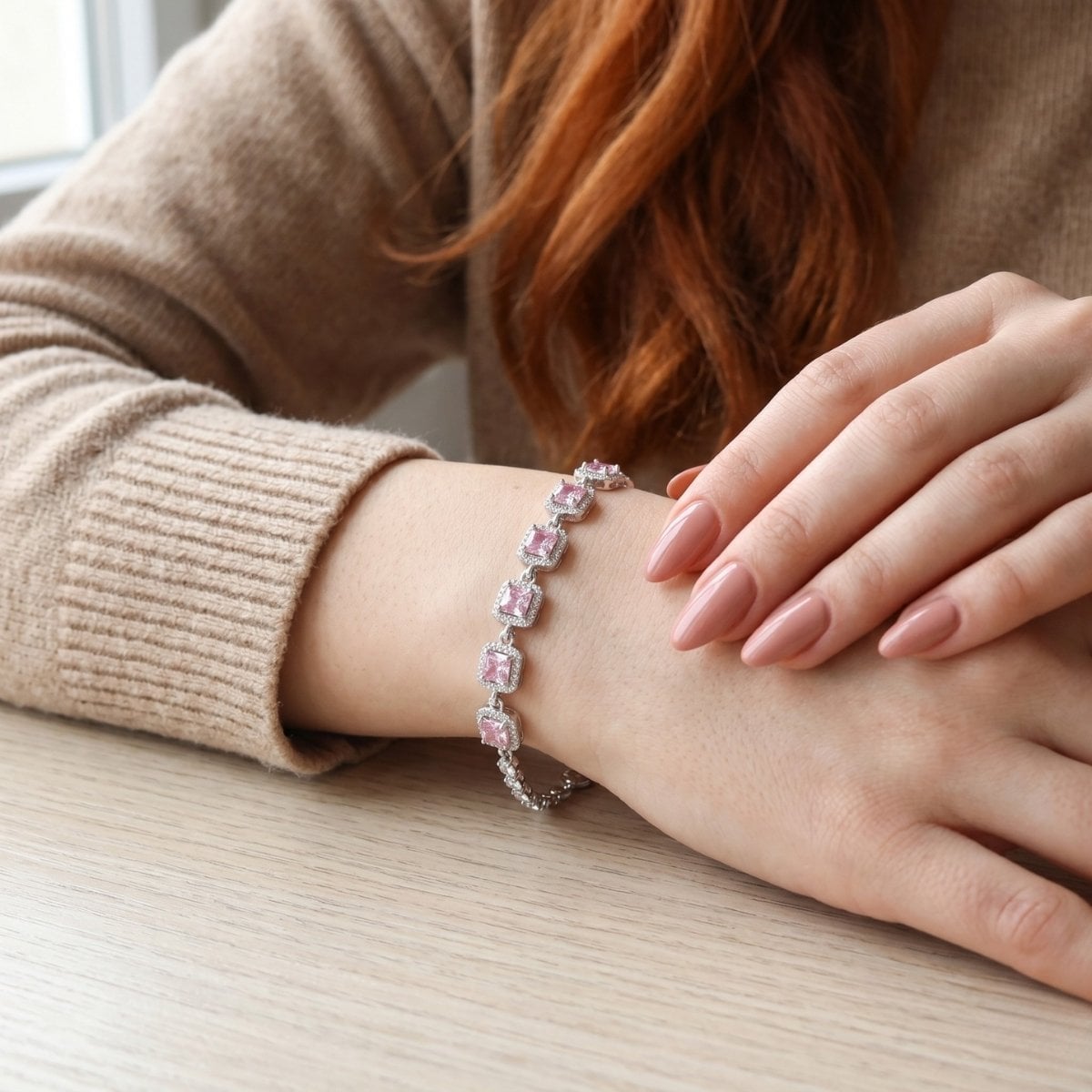 Pembe Zirkon Taşlı Gümüş Kare Model Bileklik