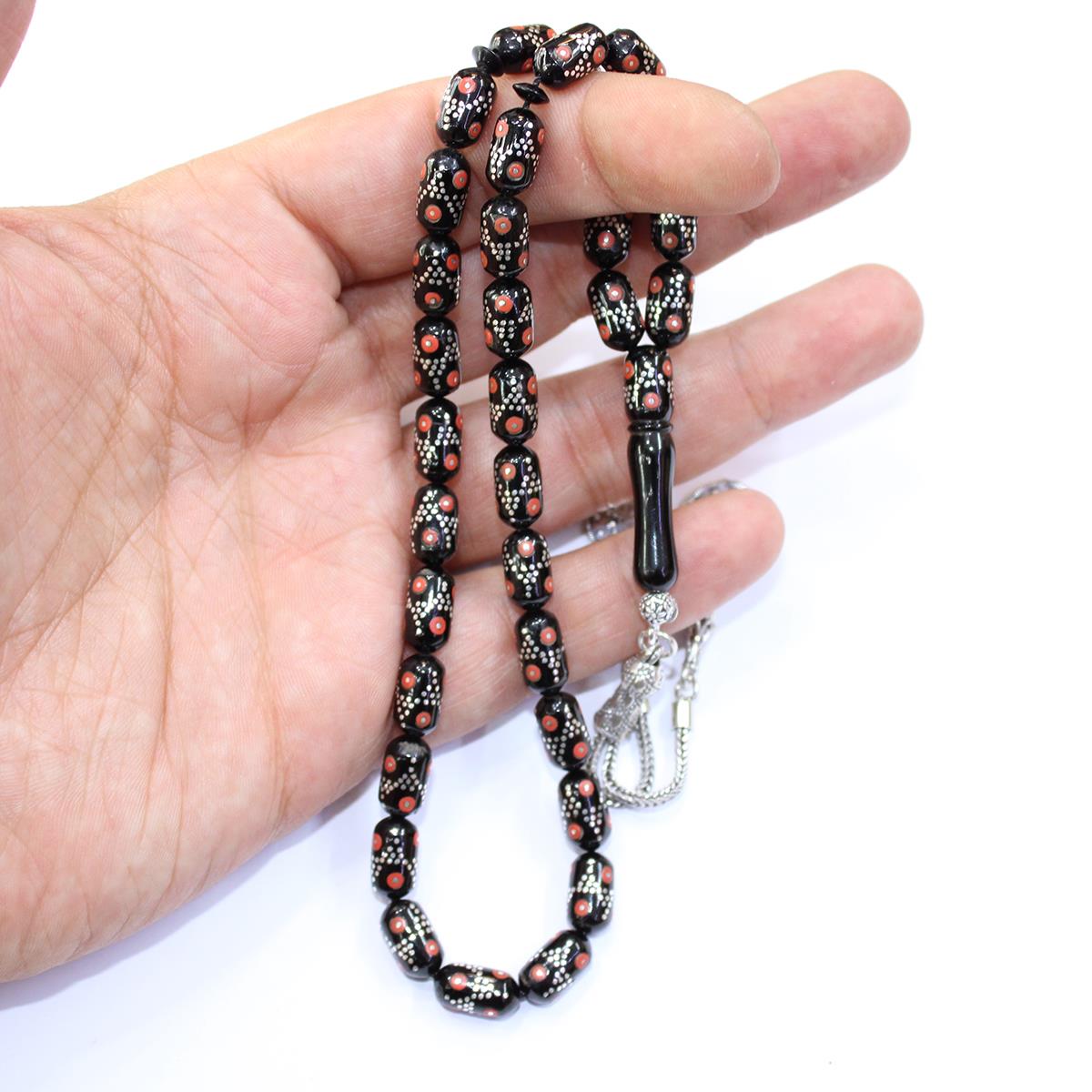 Piramid Mercan İşlemeli Oltu Taşı Tespih 6*11 (mm)