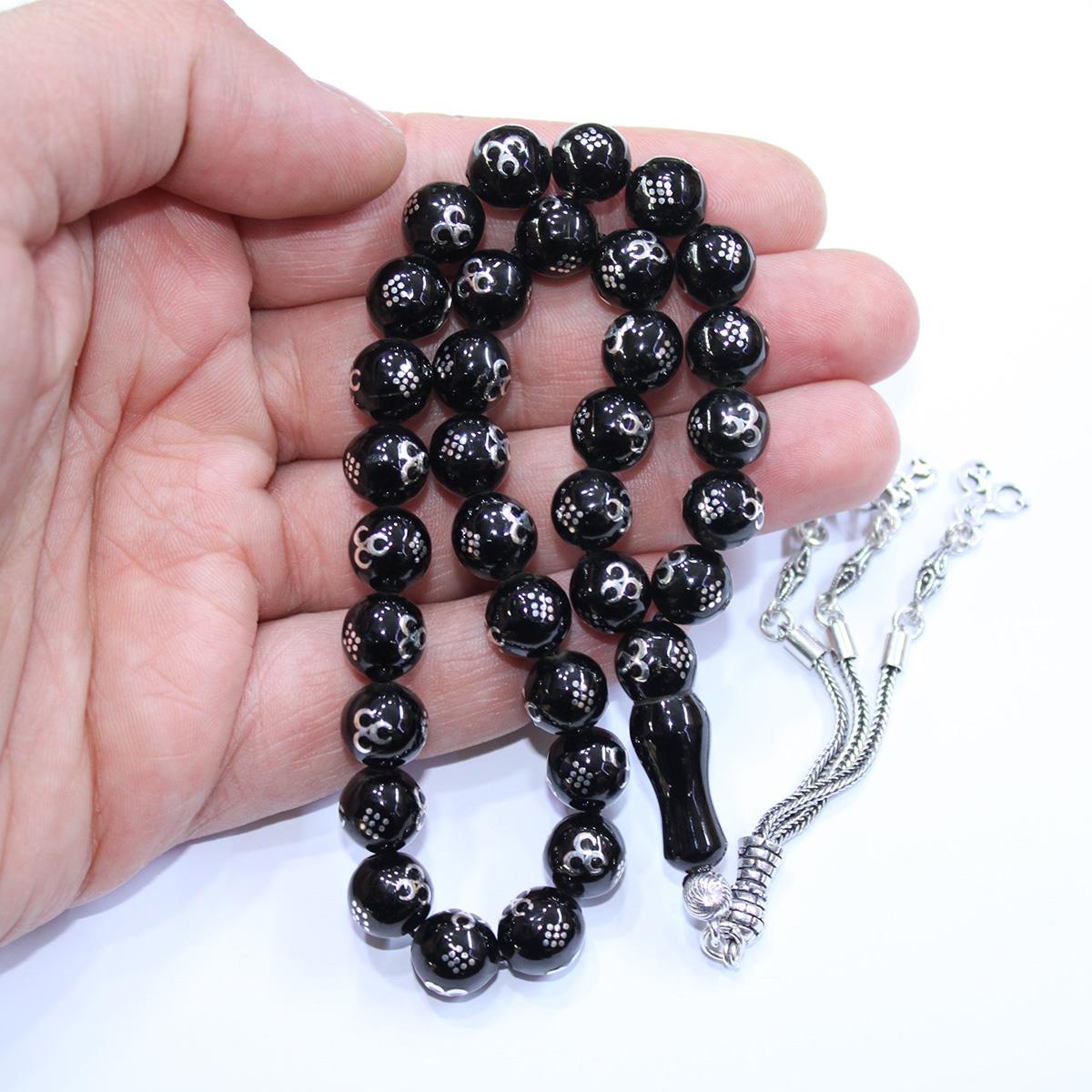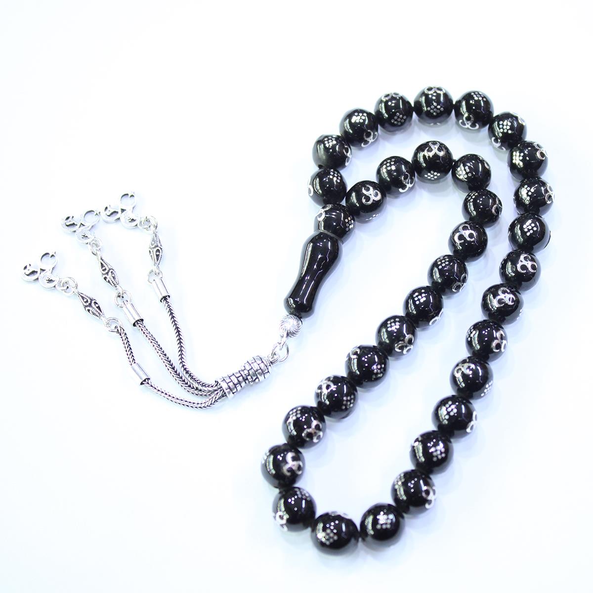Üç Hilal İşlemeli Oltu Taşı Tespih 9 (mm)
