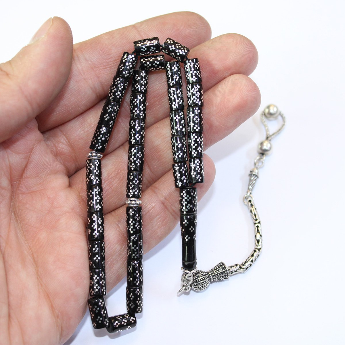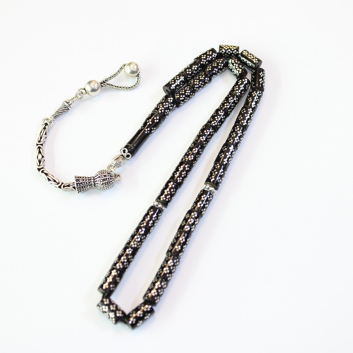 Üçlü Dörtlü İşlemeli Kesme Oltu Taşı Tespih 5*8,5 (mm)