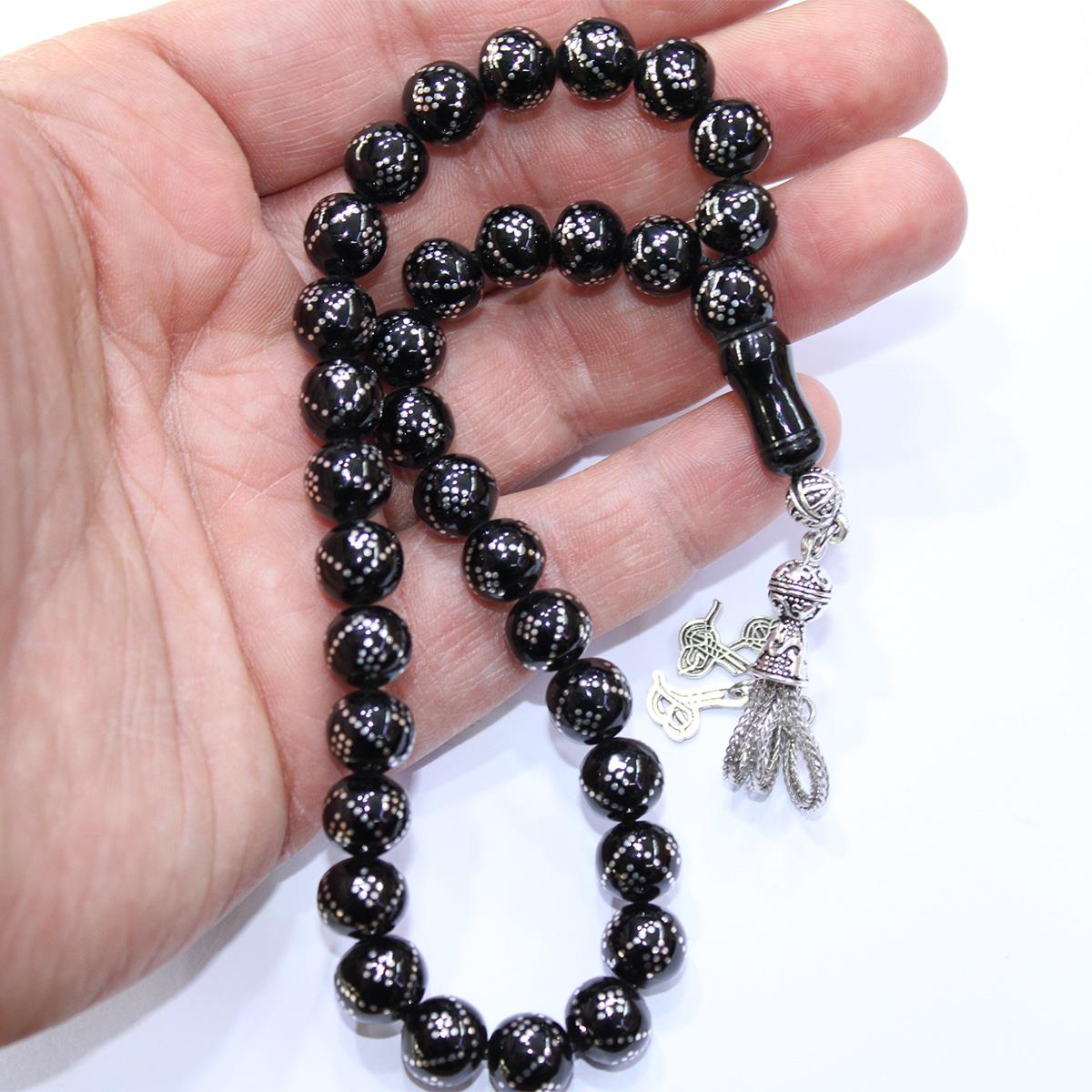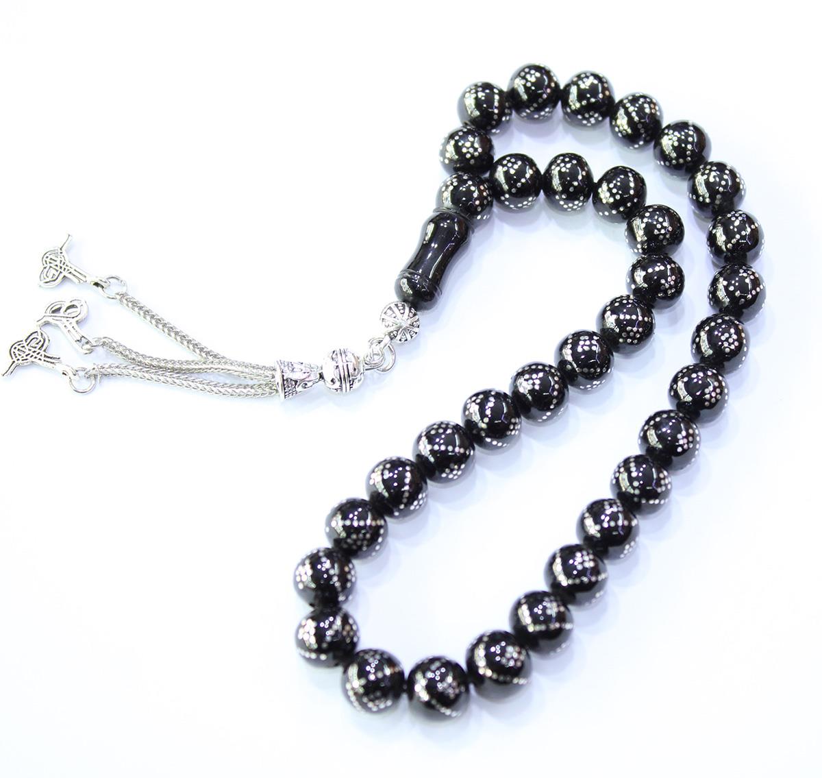 V Baklava İşlemeli Küre Oltu Taşı Tespih 9 (mm)
