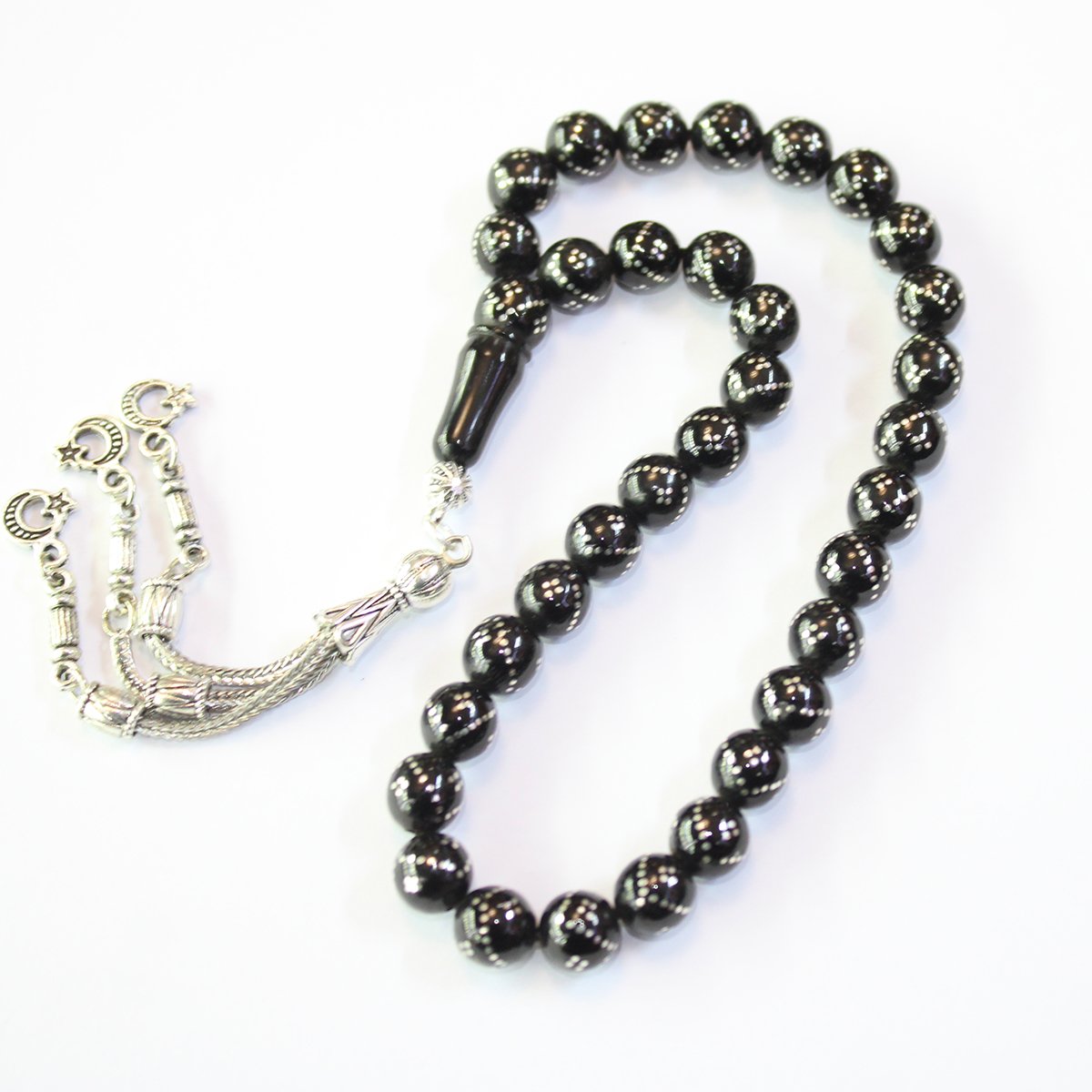 V Dörtlü İşlemeli Oltu Taşı Tespih 8 (mm)