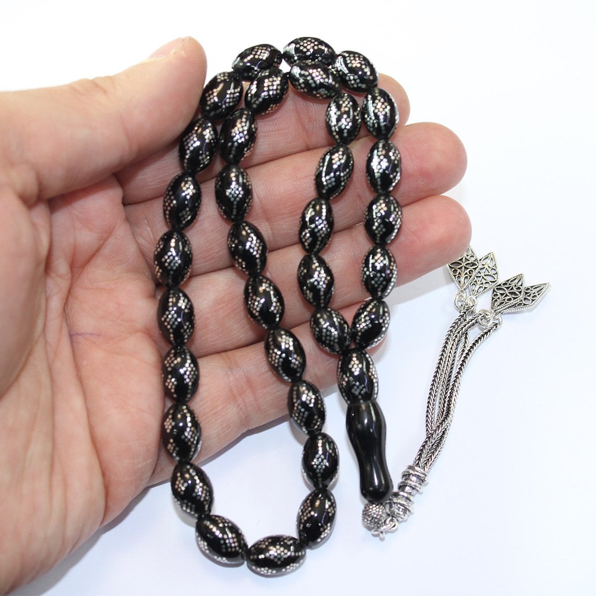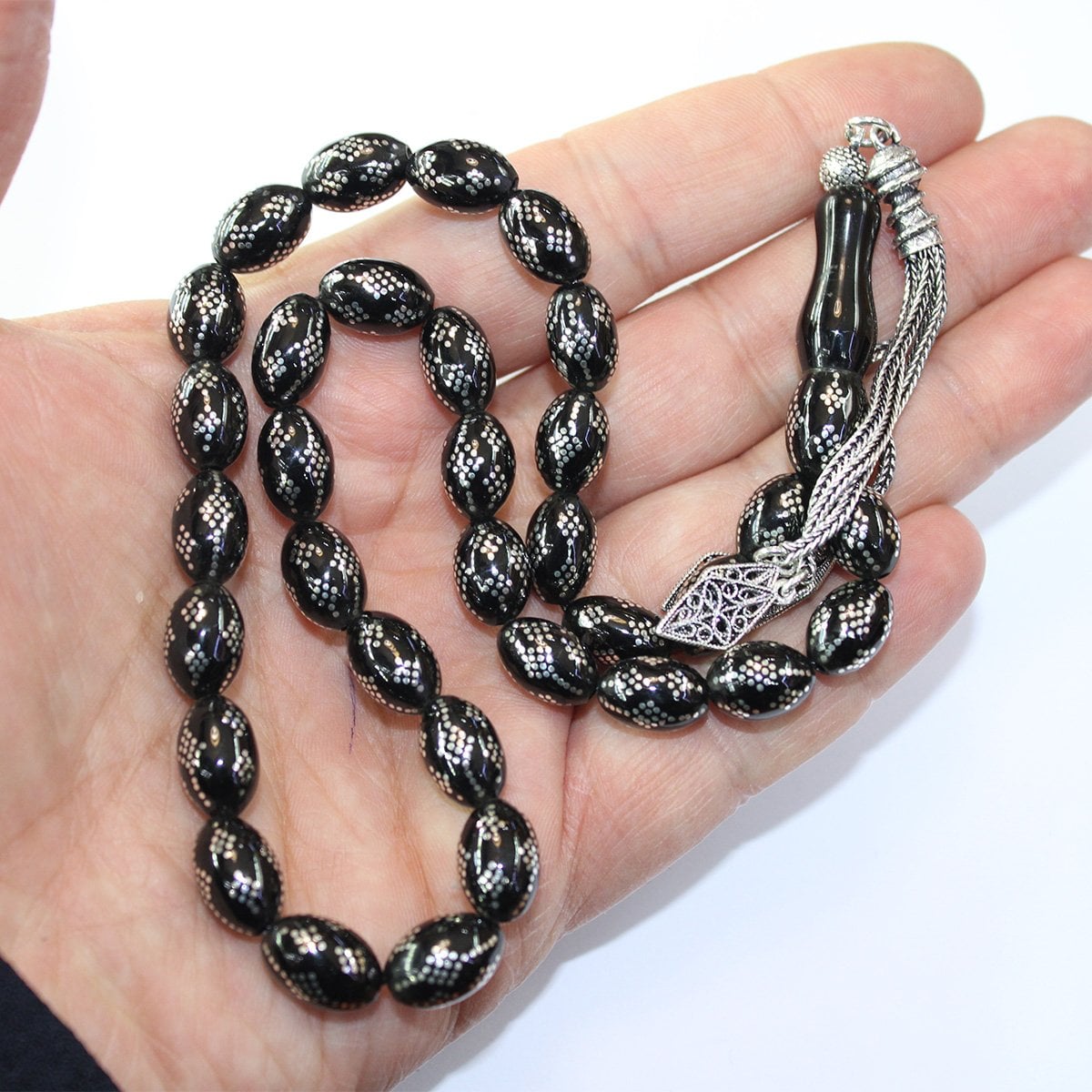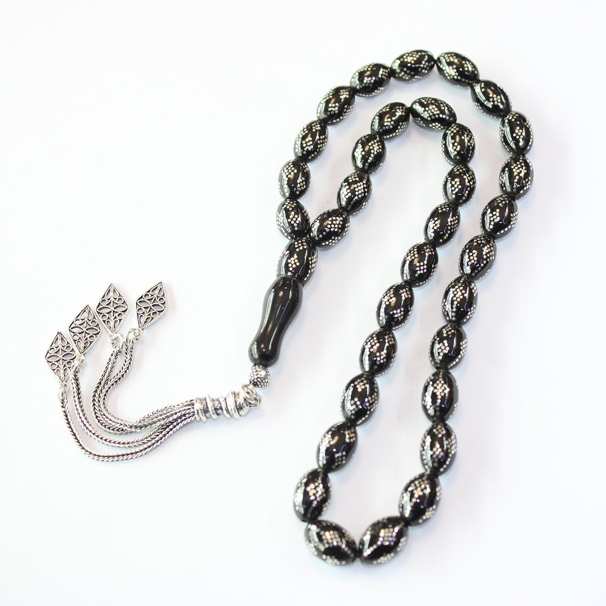 Yoğun Baklava İşlemeli Oltu Taşı Tespih 8*12 (mm)