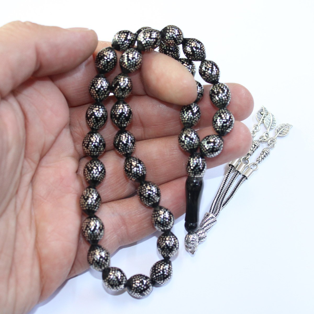 Yoğun Piramid İşlemeli Oltu Taşı Tespih 8,5*10,5 (mm)